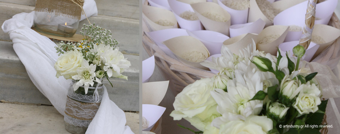 So Spring Wedding and smelled spring, when two young people left for little beautiful Santorini and chose to marry in Syros island. Logs of wood, burlap, lace, countless jars with candles and scents of roses, freesias, buttercup, chrysanthemum and camomile small touches, all in white color, created a romantic spring atmosphere.
