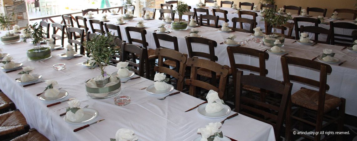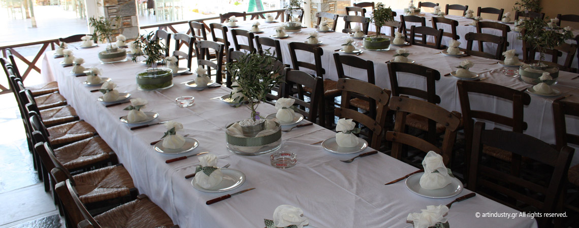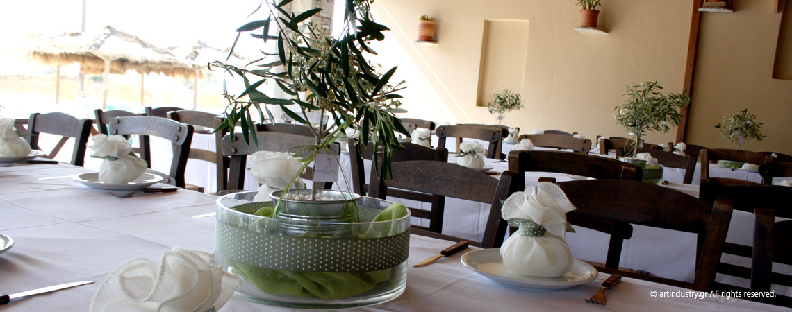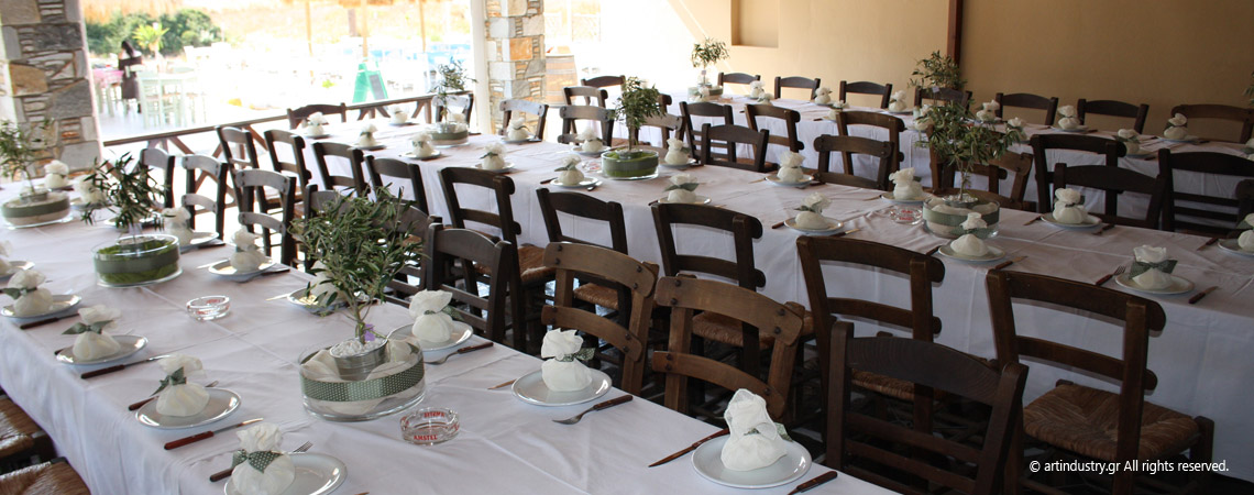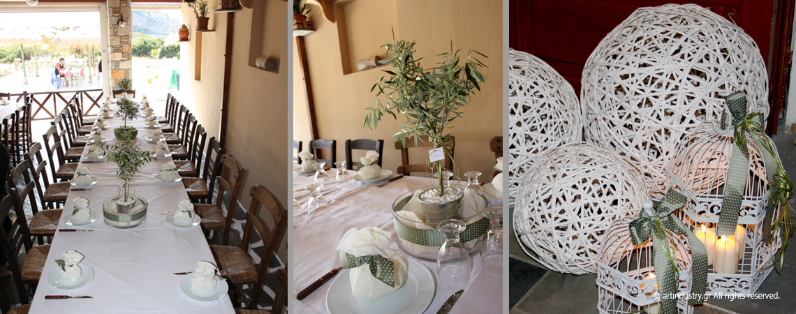 Ένα γραφικό ταβερνάκι στον Γαλησσά επιλέχθηκε για να φιλοξενήσει τους καλεσμένους του ζευγαριού μετά την τελετή του γάμου τους. Το εξαιρετικό φαγητό, ο ρυθμός της κρητικής λίρας και οι όμορφες μινιμαλιστικές ελιές πλαισίωσαν αρμονικά και βοήθησαν στην υλοποίηση ενός πραγματικά όμορφου γάμου.